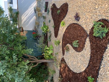 fedett terasz és nyitott napozóterasz, hintaágyakkal, asztalokkal, kertiszékekkel, csodálatos kerttel