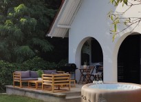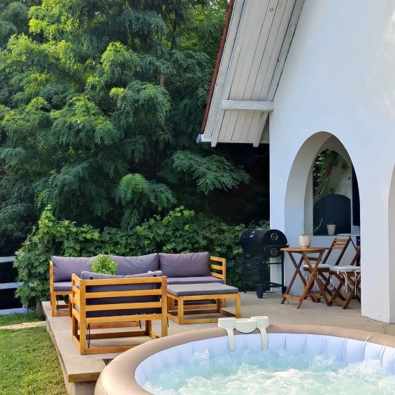A Delux 4 fős üdülőház jakuzzival, gyönyörű kerttel, szőlőültetvénnyel, valamint sütővel és mikróval ellátott, felszerelt konyhával, kandallós nappalival és modern szobával várja a vendégeket.